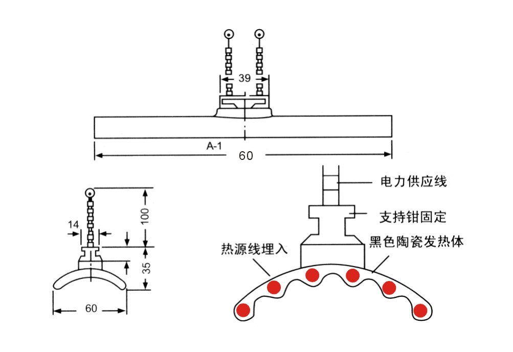 1.電源線埋鑄式,不氧化、耐撞擊,永久性壽命。 2.可單體控制溫度,也可組立排列加熱。 3.密集排列時,上下左右一致,可獲得更理想的均勻溫度。 4.中空斷熱保溫,發熱加速。 5.溫度均勻,不掉色釉。